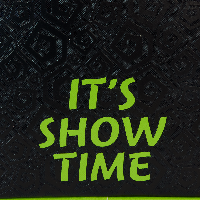 Side pockets with black and white stripes and eerie green trim