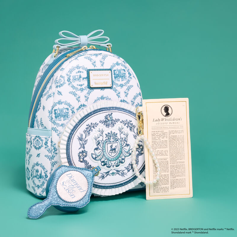 This card holder is in the shape of one of Lady Whistledown’s society papers. You’ll find embroidered and embossed details on the article. You can carry it over your wrist with a detachable wristlet strap made of real pearls! Turn it around to find four card slots.